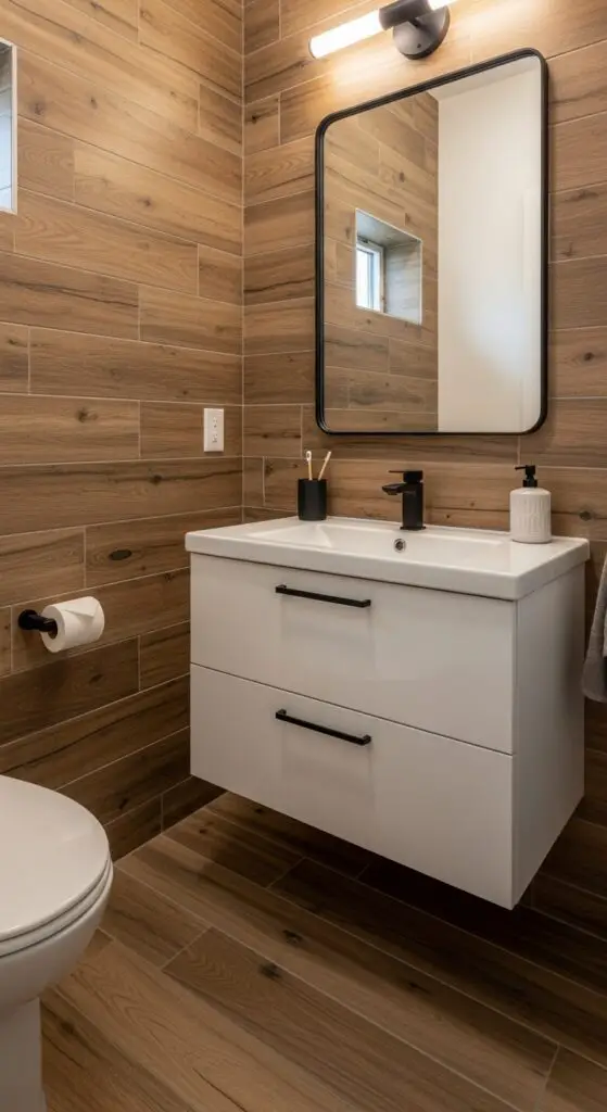 Install them on accent walls behind vanities or as flooring for maximum impact. You can mix different plank widths to create visual interest while maintaining your design freedom. They’re perfect for creating cozy, spa-like retreats that feel inviting yet completely practical for daily use.