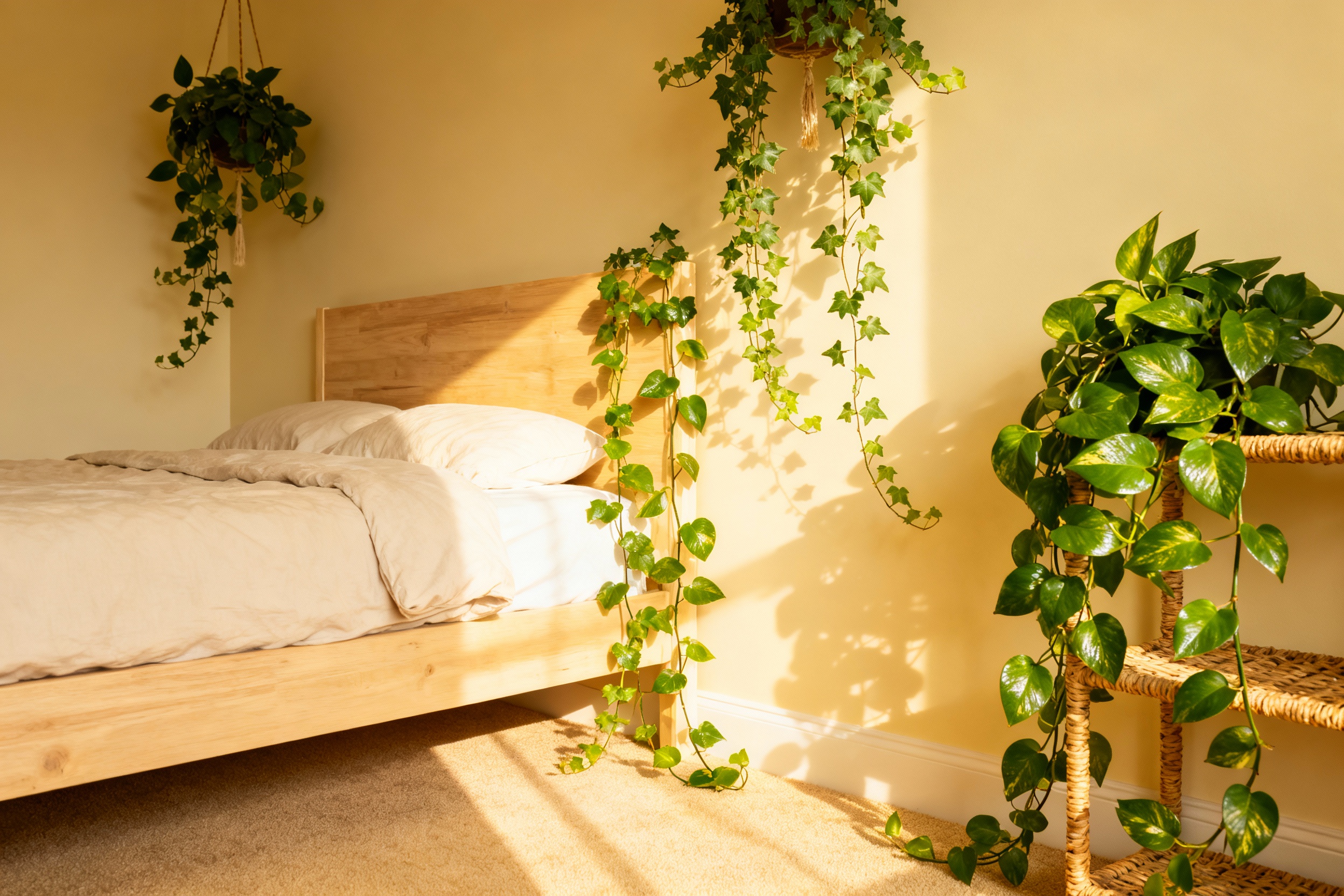 Hanging vines in your bedroom turns bland into botanical with a few smart choices.