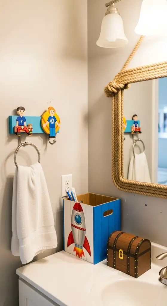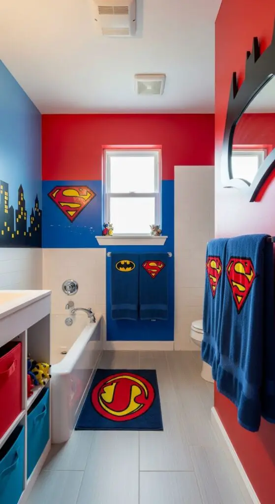 Creating a playful yet functional superhero space ensures the bathroom remains practical while delivering maximum entertainment value for your little hero.