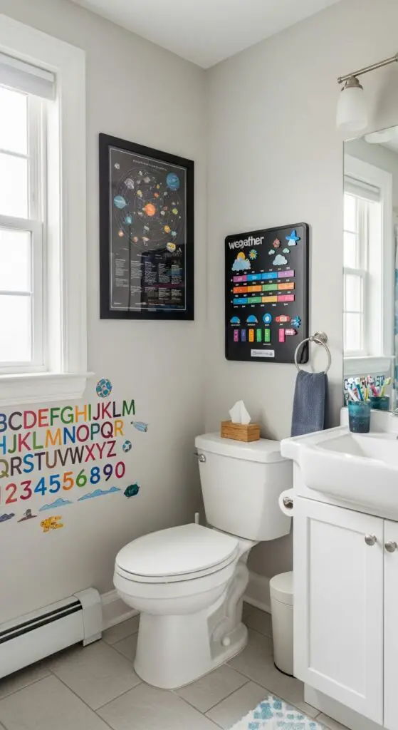 Wall-mounted activity centers with sliding puzzles, counting beads, or geography maps turn waiting time into productive learning moments while maintaining the bathroom’s functionality.