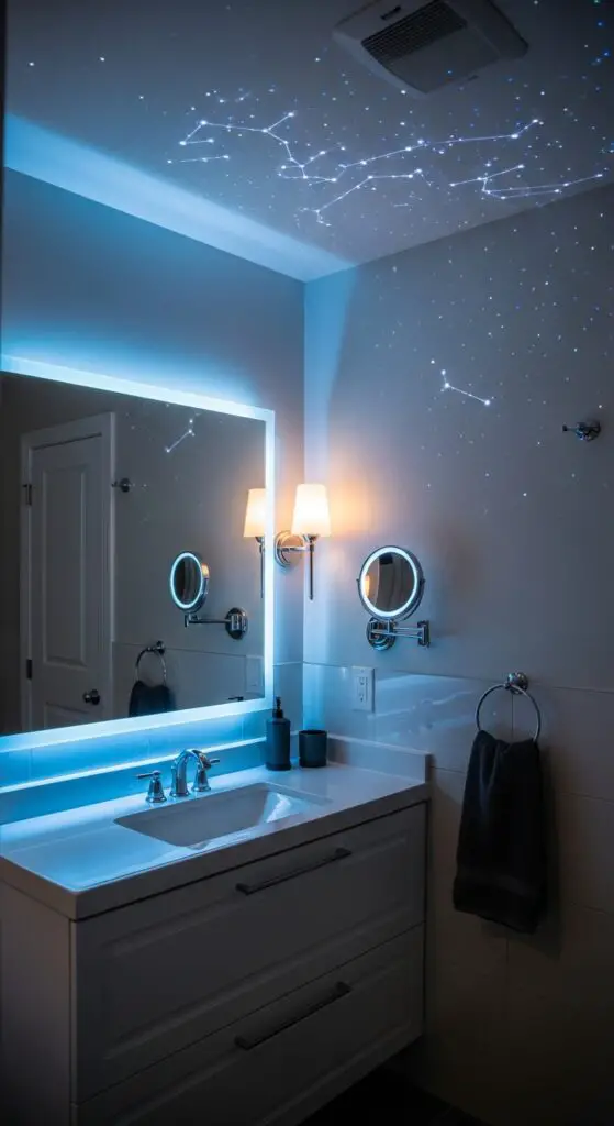 Install LED strip lighting behind mirrors to create a spacecraft control panel effect. Choose lunar landing decor featuring moon-phase shower curtains and rocket ship towel holders.