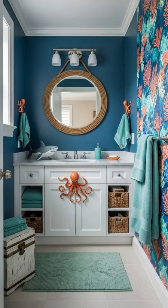 Install pirate ship decor like a ship wheel mirror or treasure chest storage that doubles as functional seating. Marine animal motifs work perfectly through octopus towel hooks, shark-shaped soap dispensers, and dolphin bath mats. Consider adding porthole-style windows or nautical rope accents around mirrors. Transform the space with ocean colors like turquoise, aquamarine, and seafoam green that instantly create a calming underwater atmosphere. These design elements create an immersive aquatic environment that makes every bathroom visit feel like unearthing hidden treasures.