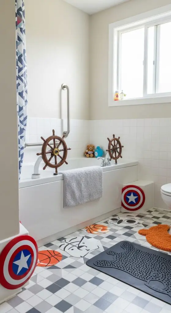 When you’re designing a boy’s bathroom, clever safety features can double as exciting decorative elements that protect your child without compromising the room’s fun atmosphere. Install pirate ship wheel grab bars for support near the tub and toilet areas.