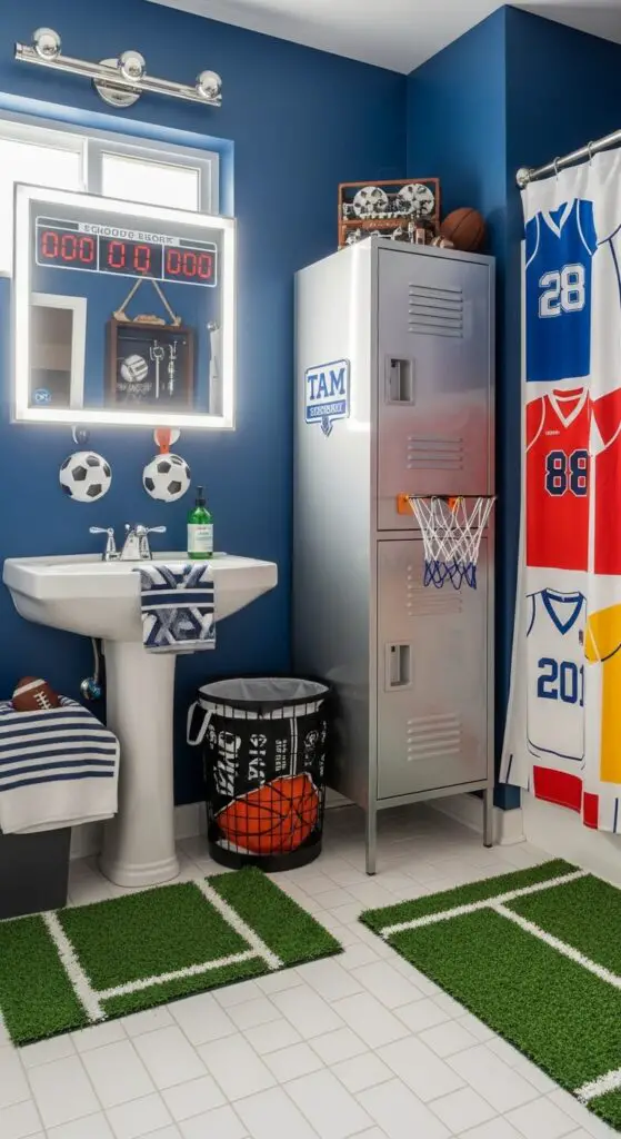 Field inspired finishes bring the stadium home through artificial turf bath mats and locker-style storage cabinets. Install scoreboard mirrors that display time and temperature while adding authentic sports atmosphere. Choose team colors for paint schemes and coordinate with jersey-style shower curtains.