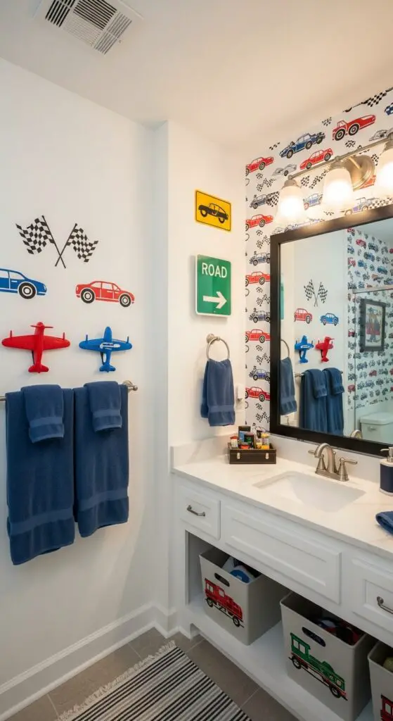 Add monster truck decals around mirrors and light switches for dimensional impact that brings vehicles to life. Install airplane-shaped towel hooks and train-themed storage bins to maintain organization while reinforcing your chosen theme. Consider automotive-inspired lighting fixtures and road sign artwork to complete the transformation. Incorporate stylish fixtures that blend modern design elements with your transportation theme for a polished look.