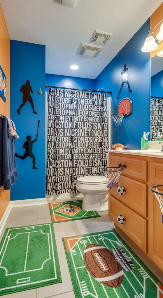 Install basketball hoop towel holders and soccer ball drawer pulls for functional fun. Choose shower curtains featuring favorite sports or motivational quotes about muscle building activities. Add rubber mats shaped like football fields or baseball diamonds for safe, themed flooring.