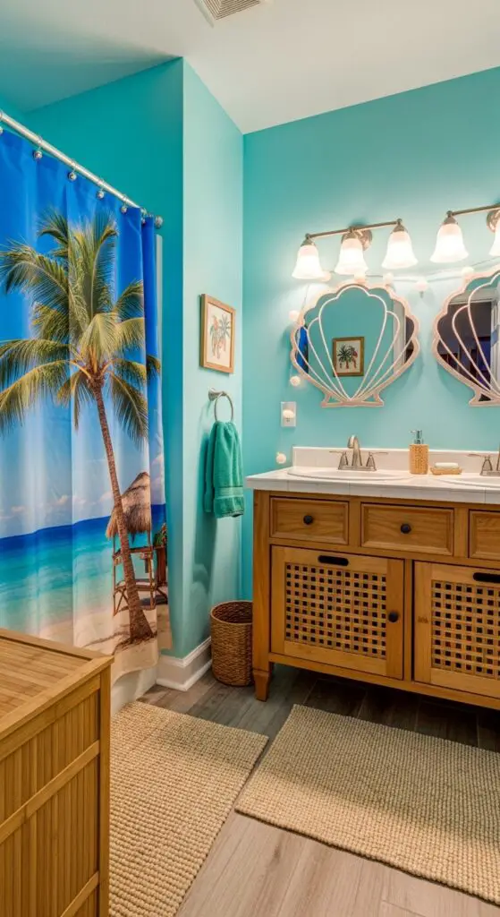 Add a palm tree cabana shower curtain featuring swaying fronds and sandy beaches to create instant paradise vibes. Incorporate seashell accents through decorative mirrors, soap dispensers, and towel hooks shaped like starfish or coral.