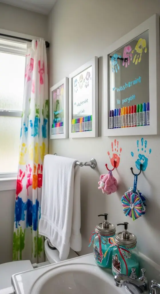 Creating your own bathroom decorations with your children remodels ordinary spaces into personalized creations while building precious memories together. Start with simple painted handprint towel hooks that’ll showcase your little ones’ growth over time.