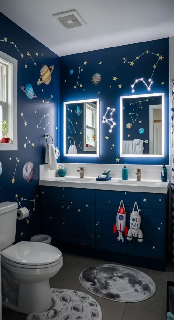 Your child’s bathroom into an interstellar expedition where daily routines become exciting space missions through strategic galaxy-themed design elements. Install glow-in-the-dark star stickers across walls and ceiling to create constellations that reveal galactic wonders during nighttime visits.
