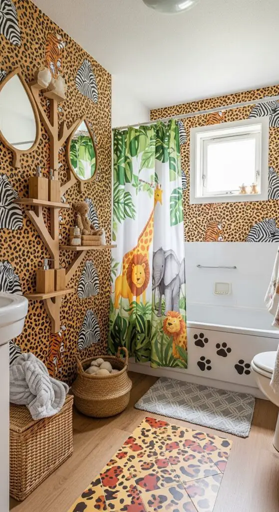 Install wooden shelving resembling tree branches to display nature inspired accessories like bamboo soap dispensers and leaf-shaped mirrors. Add safari-themed shower curtains showcasing elephants, lions, and giraffes roaming through lush greenery.