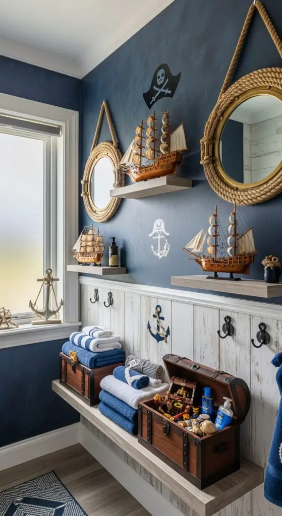 You’ll transform ordinary storage needs into expeditionary opportunities by incorporating treasure chest storage boxes for towels, toys, and toiletries. Add rope-wrapped mirrors, porthole-style windows, and anchor-themed hooks to complete the pirate aesthetic. Consider navy blue and gold color schemes with weathered wood accents that’ll make every bath feel like uncovering buried treasure on a mysterious island.