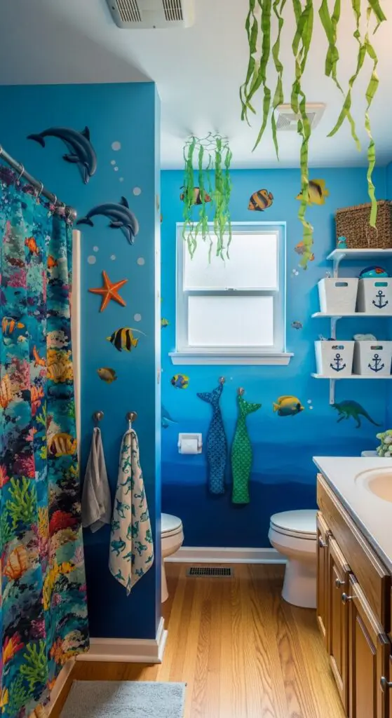 Install seaweed hanging decor from the ceiling to create an immersive underwater atmosphere. Choose shower curtains with tropical reef patterns and incorporate mermaid tail accessories like towel hooks shaped like fins. For parents seeking even more prehistoric adventure, consider incorporating dinosaur-themed elements alongside marine life to create a fascinating land-and-sea combination. Add ocean-sound nightlights and nautical storage bins to complete this magical maritime escape that’ll make bath time absolutely irresistible.