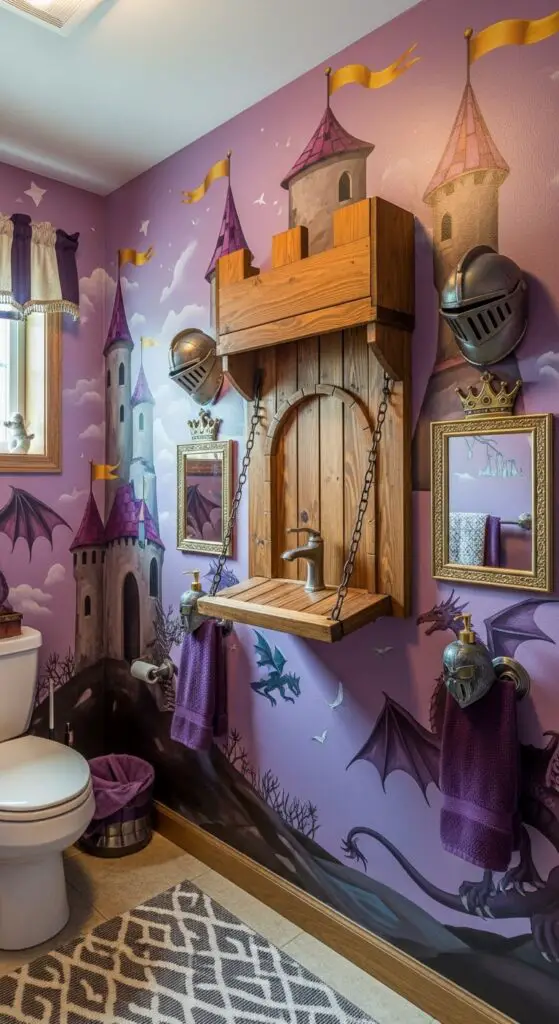 Install a wooden castle drawbridge as a unique entry door or decorative wall feature. Paint murals depicting majestic towers, flowing banners, and mystical scenery across bathroom walls. Add dragon guardians through colorful decals or sculptural soap dispensers that protect the royal bathing chamber.