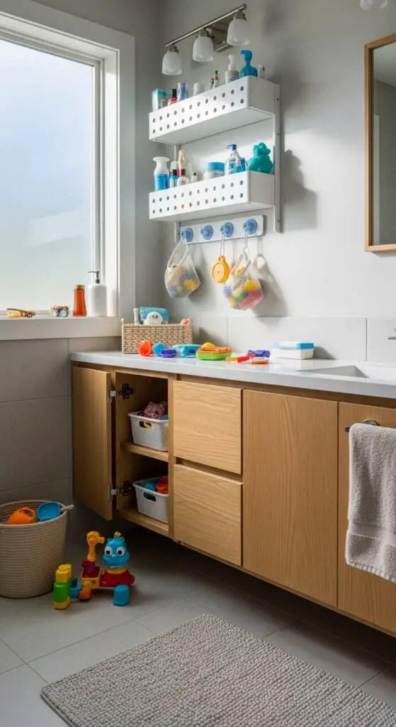 Install custom wall shelving with drainage holes to keep toys off slippery surfaces. Consider hidden storage compartments built into tub surrounds or vanity areas for larger items. Wall-mounted mesh bags and suction cup caddies work perfectly for smaller toys while allowing proper ventilation.