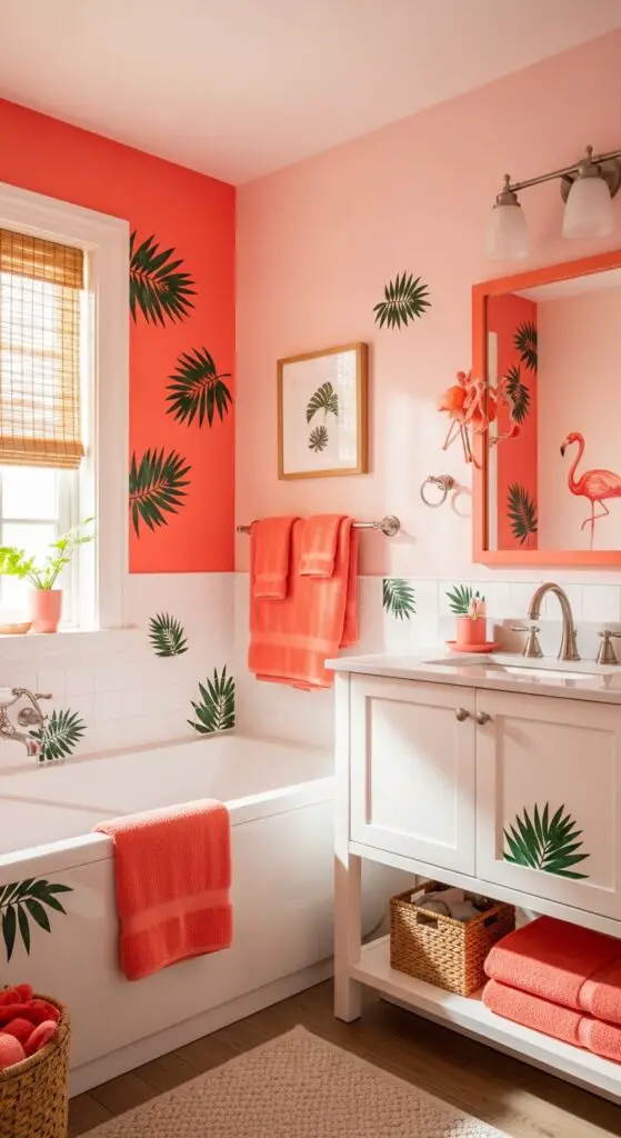 Consider painting one accent wall in vibrant coral while keeping remaining walls in soft blush pink. Add tropical foliage accents through stenciled palm fronds or banana leaves in deeper green shades. Incorporate flamingo silhouette motifs near the mirror or above the bathtub for fanciful charm. You can extend the theme with coral-toned accessories and natural bamboo elements for authentic tropical vibes.