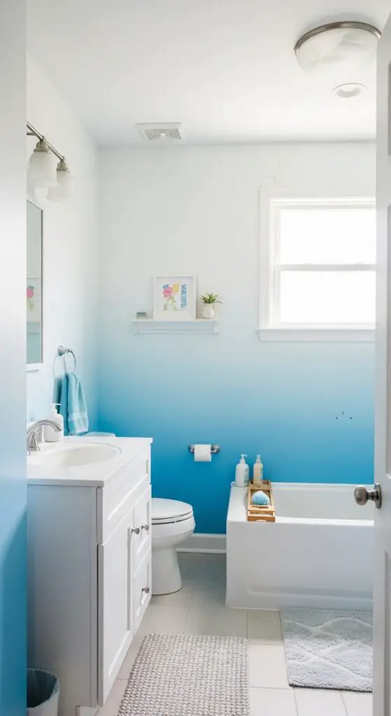 When you’re seeking a softer, more ethereal approach to kids’ bathroom walls, ombre and gradient techniques create stunning visual shifts that feel both calming and magical. These mesmerizing ombre effects shift seamlessly from light to dark, transforming ordinary spaces into enchanting retreats.