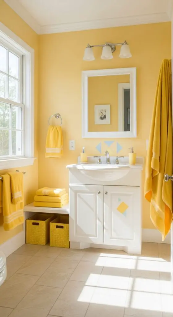 Consider pairing sunny yellow walls with white trim and fixtures to maintain a fresh, clean appearance. You can incorporate yellow tile borders or painted geometric patterns to add visual interest while keeping the design age-appropriate and timeless for growing children. When selecting stylish fixtures for your yellow-themed bathroom, focus on pieces that complement the cheerful color scheme while providing lasting functionality.