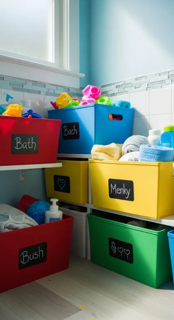 Choose colorful stackable bins in different sizes to accommodate various bathroom essentials like bath toys, toiletries, and washcloths. Add lively chalkboard labels so kids can personalize their storage spaces and easily identify contents. Consider incorporating playful themes that match your child’s interests to make the storage system even more appealing and functional.