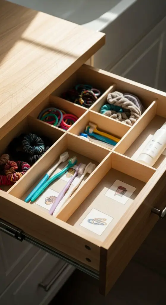 Countless tiny bathroom essentials create daily chaos in kids’ drawers, but adjustable drawer dividers reshape this cluttered space into an organized system. You’ll transform messy drawers by installing labeled dividers that separate hair ties, toothbrushes, and small toiletries into designated sections.