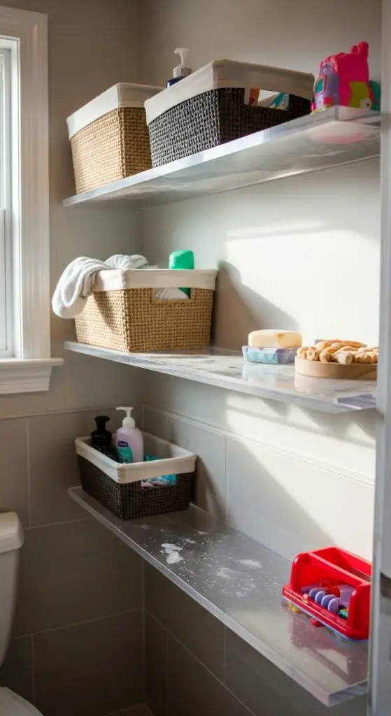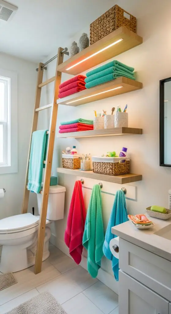 Choose floating shelves or ladder-style units that won’t overwhelm the space while providing multiple tiers for organization. Consider adding integrated lighting for visibility underneath each shelf, making nighttime bathroom visits safer for little ones. Installing towel hooks beneath these shelves creates an organized system that makes towels easily accessible for children.