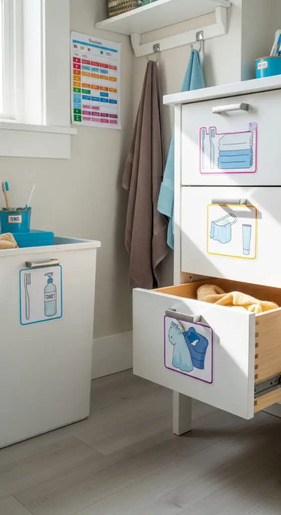 When children can easily identify where their belongings belong, they’re more likely to maintain organized bathroom spaces without constant prompts from parents. Illustration labels work exceptionally well for non-readers, featuring clear images of toothbrushes, towels, and toiletries on corresponding storage areas.