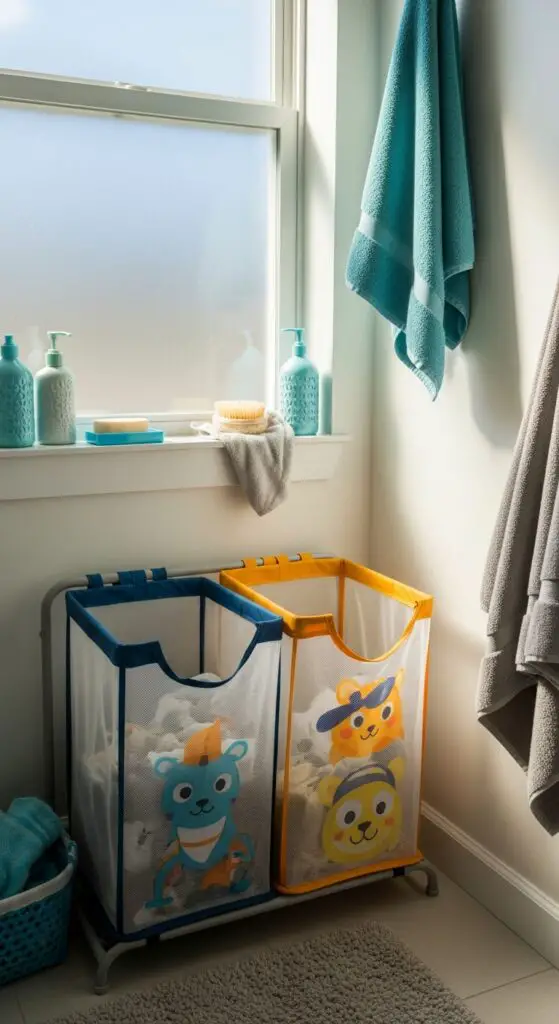 Choose themed laundry hampers featuring your child’s favorite characters or interests to create positive associations with tidiness. Position hampers at child-friendly heights near the bathtub or changing area for easy access during bath time routines.