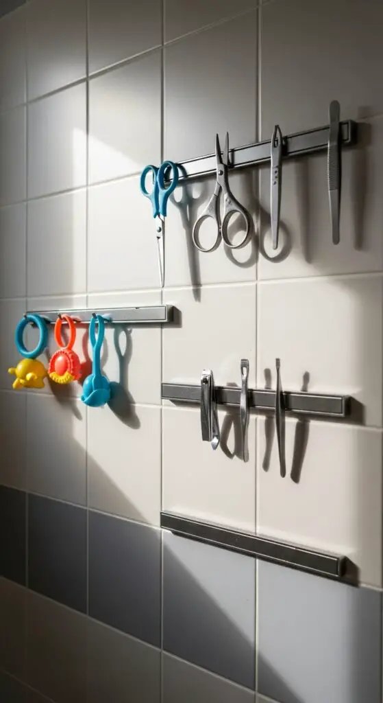 These versatile organizers hold scissors, tweezers, nail clippers, and metal bath toys without taking up precious counter space. Magnetic tool organizers work perfectly at your child’s eye level, encouraging independence during daily routines.