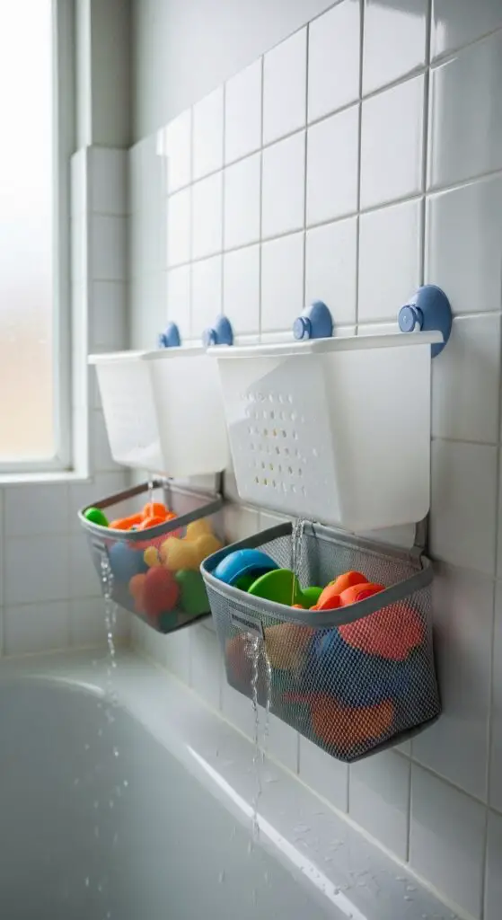Bath toys create some of the biggest storage challenges in kids’ bathrooms, especially when they’re dripping wet and covered in soap residue. Mesh storage baskets solve this problem by allowing water to drain completely while toys air-dry naturally. You’ll find these organizers attach easily to tub walls with strong suction cups or adhesive hooks.