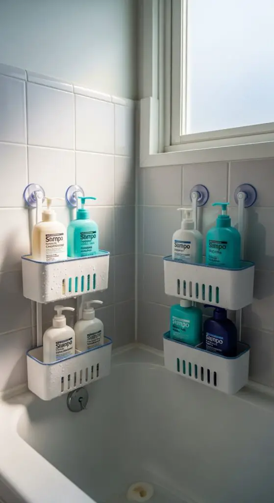 When you’re dealing with wet surfaces and slippery bottles, suction cup caddies offer a removable storage solution that keeps bath products within easy reach. These versatile organizers stick directly to shower walls or tub surfaces without permanent installation.