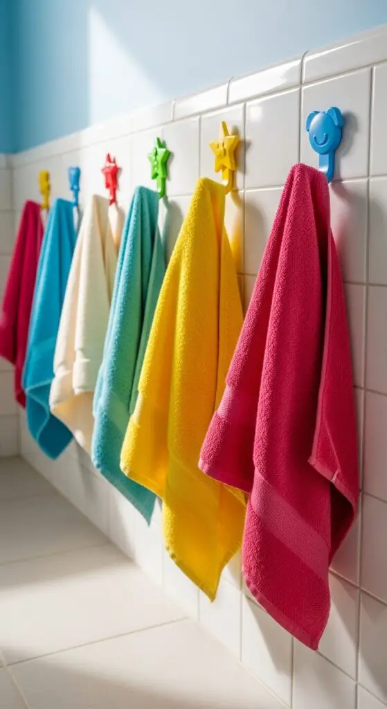 Choose hooks with fun shapes like animals, stars, or colorful designs that’ll motivate kids to hang up their towels. Mount multiple hooks to accommodate different family members’ heights and prevent towel pile-ups.