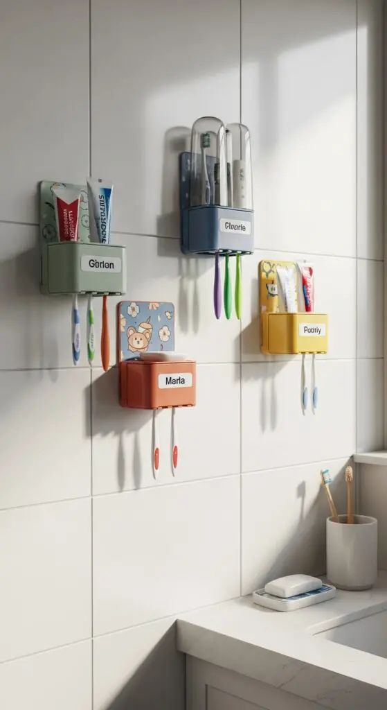 Choose personalized dispensers with each child’s name or favorite colors to encourage ownership and responsibility. Install holders at varying heights so everyone can reach their own without assistance. Look for holders with built-in covers to keep toothbrushes hygienic and protected from bathroom moisture. Bathroom organization extends beyond just toothbrushes to include proper storage for all essential items. This simple organization system teaches kids independence while maintaining a clean, functional space.