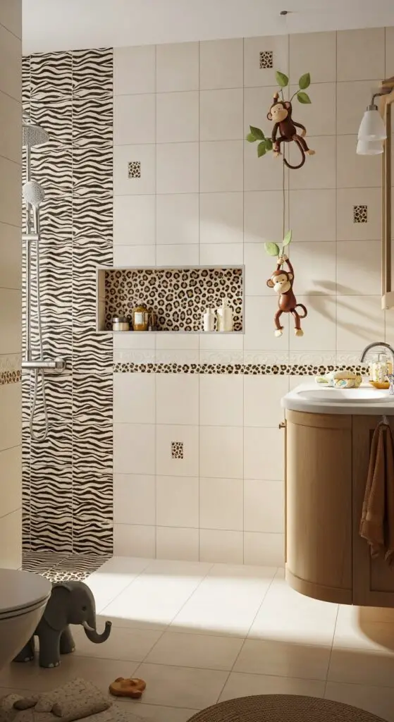Consider mosaic tiles featuring elephant silhouettes or lion motifs for backsplashes behind vanities. Safari animal accents like monkey-themed borders add playful charm without overwhelming the space.