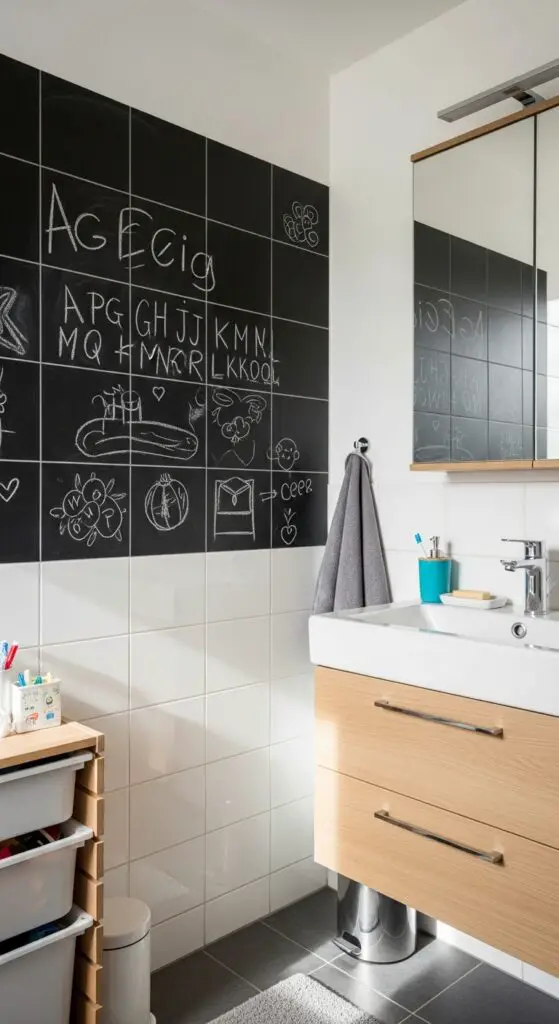 Since creativity flourishes when children have designated spaces for artistic expression, chalkboard tiles convert bathroom walls into interactive learning environments where kids can draw, practice letters, or solve math problems during bath time. You’ll find these tiles incredibly versatile, allowing complete freedom to alter your child’s bathroom into a personalized learning space.