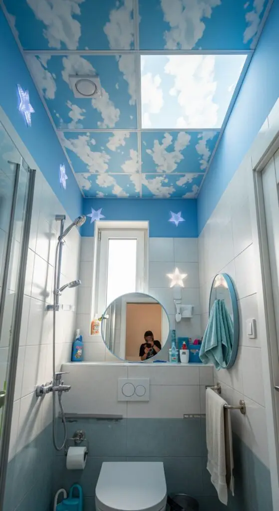 Metamorphose your child’s cramped bathroom into an airy, imaginative space by installing cloud and sky ceiling tiles that create the illusion of endless overhead room. Choose lightweight foam tiles featuring fluffy white clouds against soft blue backgrounds to maximize visual height.