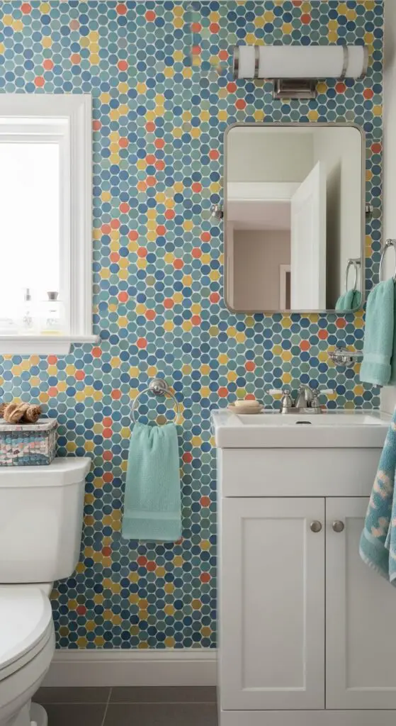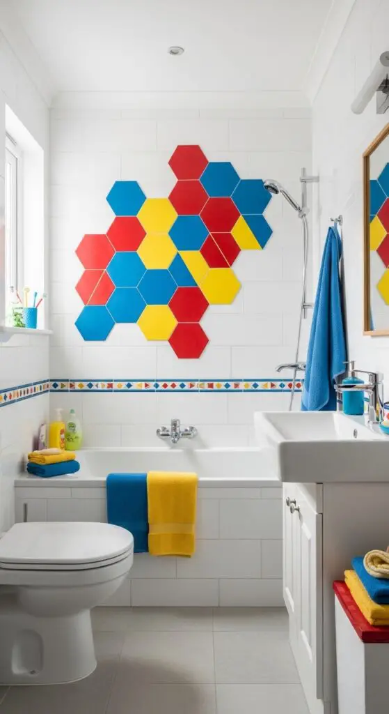 Install hexagon tiles as an accent wall behind the vanity or extend them throughout the entire bathroom for maximum impact. The key is keeping everything organized and fun while making the most of your available square footage.