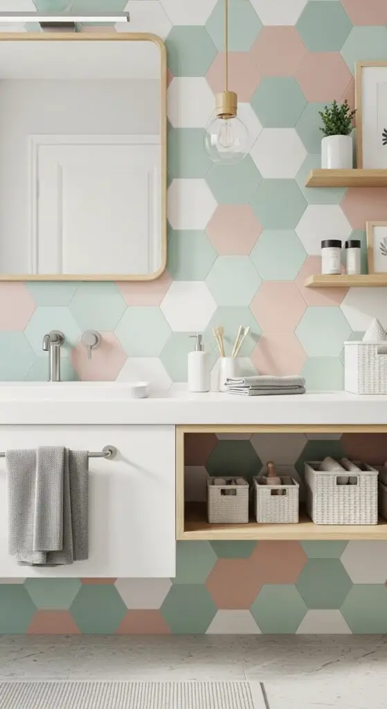 Consider mint green hexagons paired with white grout for a fresh, spa-like feel. Blush pink tiles create warmth without overwhelming the space. You can mix multiple soft pastel colors in a gradient pattern or alternate between two complementary shades.