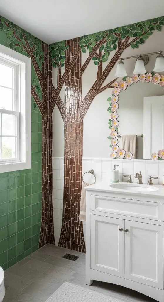 You’ll create peaceful nature scenes by combining earthy green tiles with brown tree trunks that stretch across accent walls. Fanciful floral arrangements work beautifully around mirrors and vanity areas, using soft pink, yellow, and purple ceramic pieces to form delicate blooms.