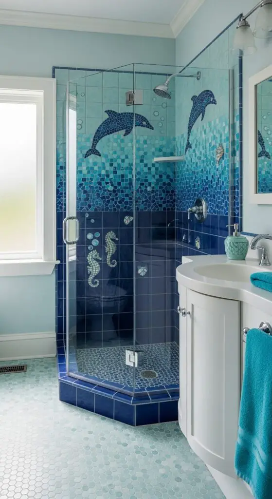 When you’re designing a kid’s bathroom that captures the magic of the deep sea, ocean-themed mosaic tiles convert ordinary walls into enchanting underwater worlds. Choose blue gradient mosaics that shift from light aqua to deep navy, creating depth and motion. Incorporate aquatic animal silhouettes like dolphins, seahorses, and tropical fish using contrasting tile colors.