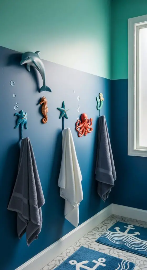 Consider underwater cave hooks designed as rocky formations with hidden sea creatures peeking through. Starfish, octopus, and whale-shaped options provide both functionality and nautical flair, encouraging kids to hang towels while exploring their submarine sanctuary. Complete the transformation with ocean colors like deep blues and sea greens that mirror the magical depths of an underwater world.