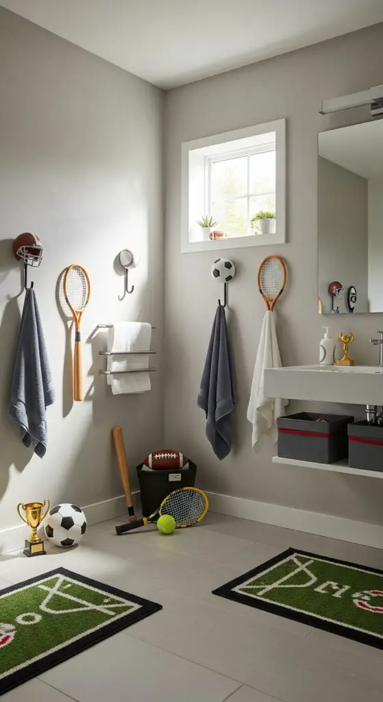 Consider soccer ball hooks, basketball hoops that actually hold towels, or tennis racket designs. These athletic accessories metamorphose mundane bathroom tasks into championship moments. Mix different sports for variety, or focus on your child’s preferred activity to create their ultimate training facility atmosphere. These stylish fixtures combine both form and function while maintaining the modern aesthetic parents desire.