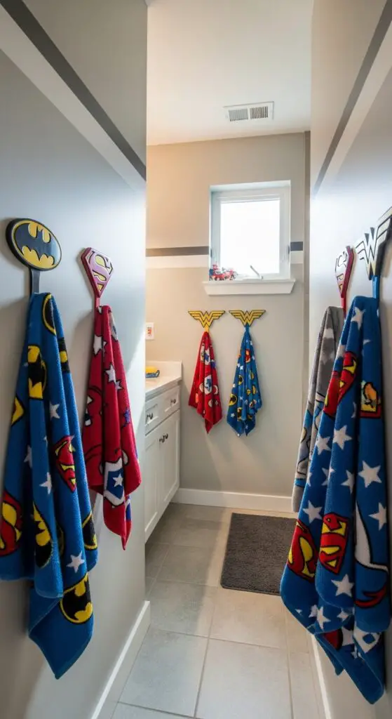 Superhero symbols blazing across bathroom walls recast everyday towel storage into heroic quests that’ll inspire your young heroes to accept responsibility. You’ll uncover superhero logos transformed into functional hooks that celebrate your child’s favorite characters while encouraging independence.