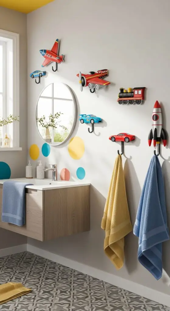 Train-shaped hooks chug along baseboards, offering multiple hanging points for towels and washcloths. Car enthusiasts will love race car hooks that speed around corners. Rocket ship hooks blast off toward ceiling heights, perfect for older kids’ towels.