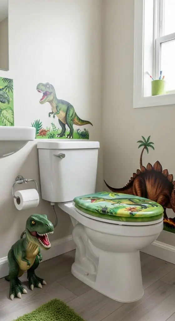 Modify your bathroom’s centerpiece into a prehistoric expedition by replacing ordinary toilet fixtures with eye-catching T-Rex designs that’ll make every bathroom visit thrilling. Choose toilet seats featuring realistic dinosaur graphics or 3D sculpted heads that create an immersive Jurassic experience.