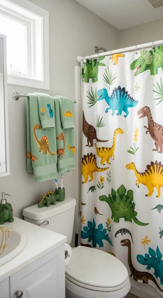 Coordinate your curtain selection with matching accessories for maximum impact. Incorporate dinosaur themed bath towels in complementary colors, along with dinosaur-shaped soap dispensers and toothbrush holders. Consider adding a prehistoric bath mat and matching window valances to create visual continuity throughout the space while maintaining your desired level of creative freedom. Remember that creating a functional space requires balancing playful elements with practical daily use needs.