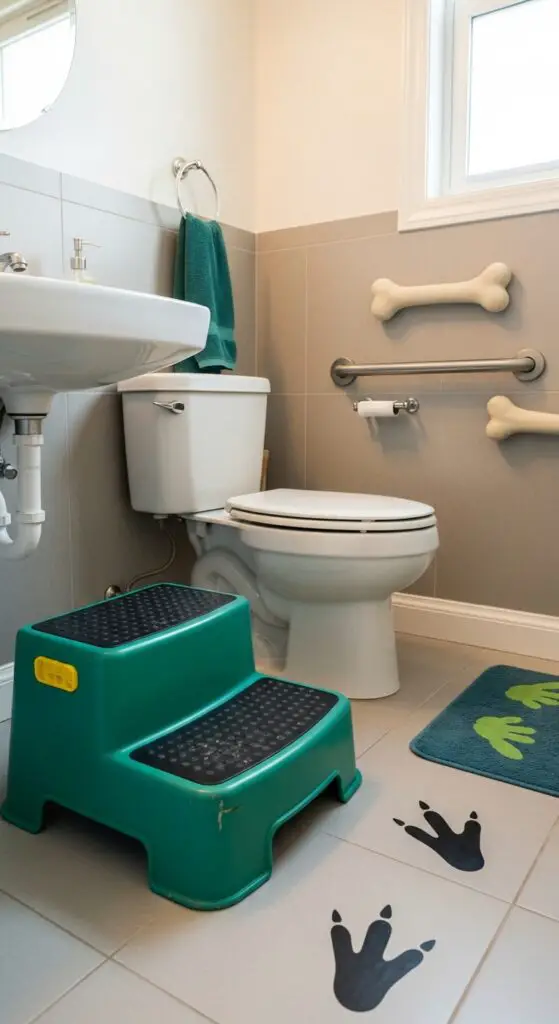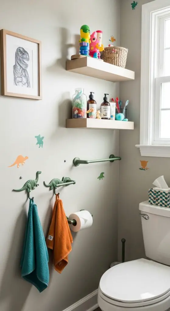 Install grab bars disguised as dinosaur bones near the sink and toilet areas. Add textured decals shaped like dinosaur footprints on slippery surfaces. These safety features convert your bathroom into an explorative zone while ensuring your little paleontologist can independently reach sinks and toilets.