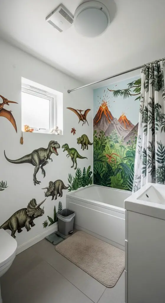 Add prehistoric themes with dinosaur shower curtains displaying massive T-Rex silhouettes against volcanic backdrops for dramatic visual impact. Incorporate life like dinosaur wall decals around fixtures to extend the theme throughout your space.