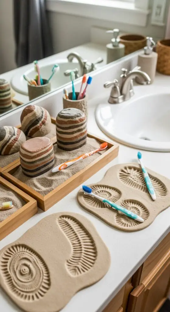 Create compartmentalized storage using shallow wooden boxes filled with kinetic sand, where toothbrushes can “excavate” from designated slots. Install durable storage solutions like rock-textured containers that mimic ancient sediment layers for soap and other toiletries.