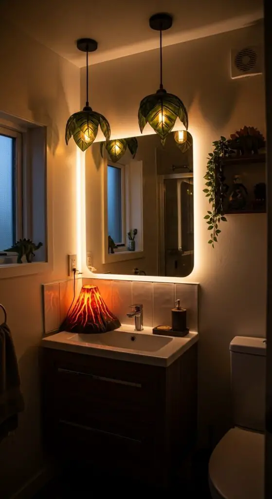 Alter your dinosaur bathroom into an atmospheric prehistoric terrain by incorporating volcano lamps that cast dramatic red and orange glows reminiscent of ancient eruptions. These eye-catching fixtures create the perfect ambiance for your child’s imaginative experiences while providing functional illumination.