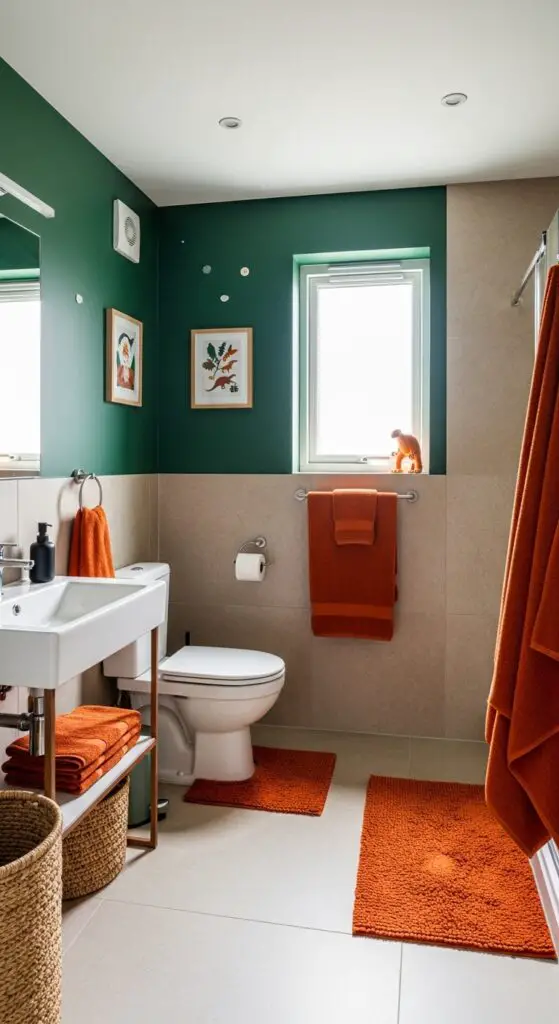 Add contrasting accent colors like burnt orange or rust red through towels and accessories to mimic volcanic landforms. Install textured wall panels in sandy beige tones to replicate ancient rock formations. Bold yellows and amber hues work beautifully for dinosaur-themed shower curtains or bath mats, evoking fossilized amber unearthings that’ll spark your child’s imagination daily.