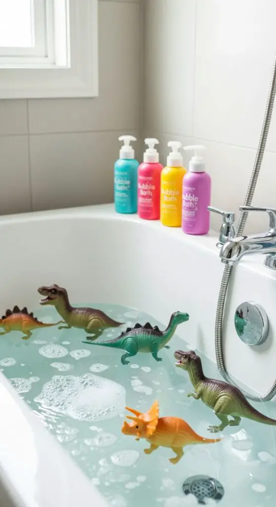 Metamorphose bath time into an exhilarating prehistoric quest by filling your bathroom with an impressive collection of dinosaur-themed toys and specially formulated bubble bath products. You’ll uncover endless bubble mixture varieties featuring tropical scents and volcano-inspired fragrances that transport kids to ancient worlds.